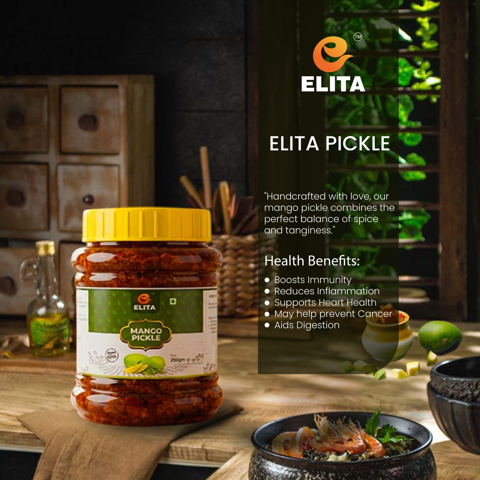 Elita brings you the true essence of homemade pickles with premium quality ingredients, ensuring taste, purity, and health in every bite.