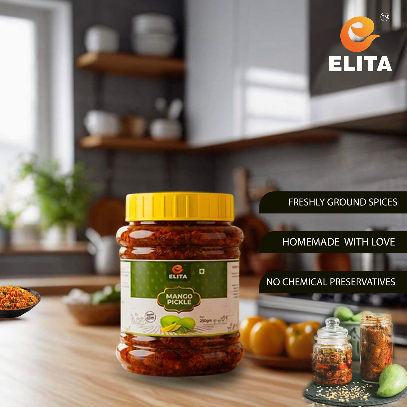 Elita Mango Pickle is a handcrafted delight made using traditional recipes and carefully selected raw mangoes blended with rich, aromatic spices. Every jar captures the authentic homemade taste that adds a burst of flavor to your everyday meals.